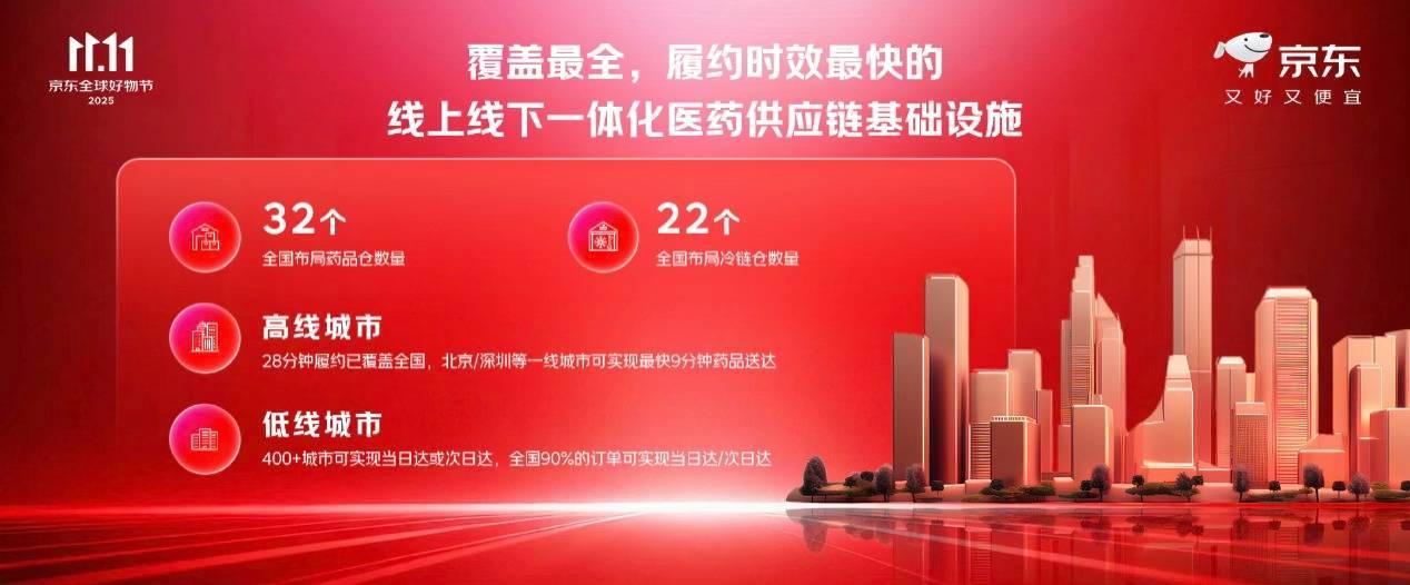 京东到家快检的服务范围已覆盖全国23城,能提供呼吸道病原等160多项检测服务;京东护士到家已覆盖全国47城,能够提供打针采血等64项专业护理服务。京东买药秒送为用户提供最快9分钟送达的即时零售体验。京东医美首家自营独立门店10月在北京国贸CBD开业,超1.1万名用户参与开业礼活动,11月到店服务名额已基本约满。另有3家京东健康体检中心在北京、深圳开业。